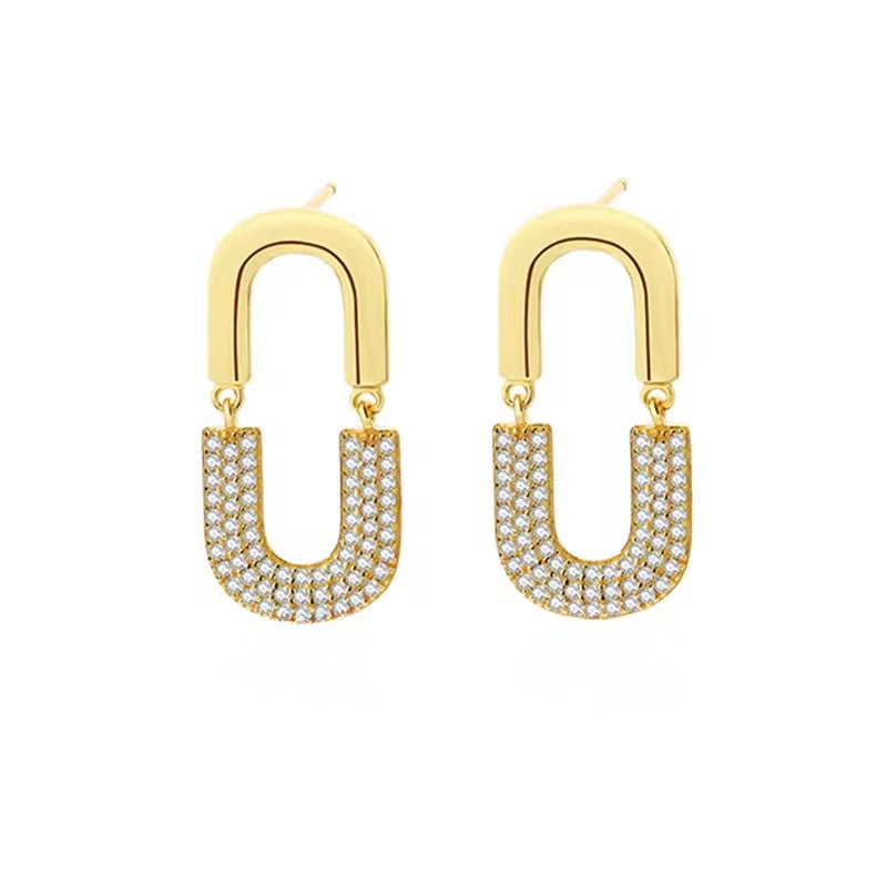 Elevate your look with the Dia Drop Earrings — a contemporary twist on timeless elegance. Crafted in 925 sterling silver and finished with a luxurious 18k gold plating, these earrings feature a sleek geometric arc design. The lower U-shaped section is adorned with rows of shimmering cubic zirconia stones, catching the light with every movement. Perfect for both day-to-night styling, they embody understated glamour and modern sophistication.